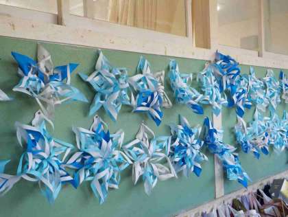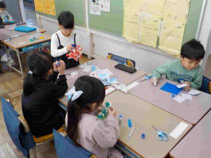 今、自分でやっていることをプリントに書き出し、自分にできることややってみたいことを考えました。自分でできることがたくさん増えました。自分にできることをさらに増やしていきます。 また、別の授業では、折り紙で雪の結晶を作りました。 折り紙に規則正しく切り込みを入れ、開いて、のり付けをしていきます。大きな雪の結晶が出来上がりました。廊下に掲示すると、とても迫力があります。 11/18 1年生 算数