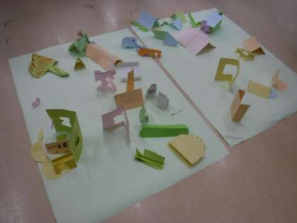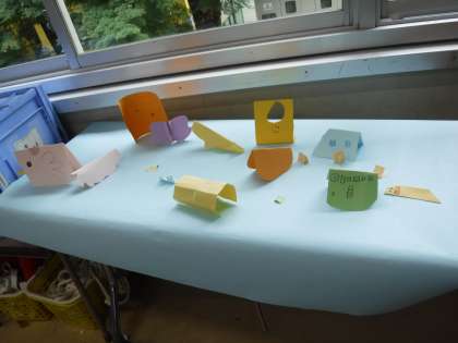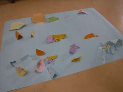 9月12日(金)の図工では、「おって たてたら」という学習をしました。紙を折って立てた形から思い付いたものを作りました。草原、海、空に見立てた模造紙にできたものを置き、それぞれの世界を作りました。こどもたちが作ったものが集まり、すてきな世界になりました。