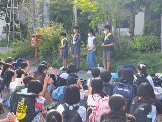 9/17 6年生 移動教室18![]() ![]() 室長が集まり、1日の振り返りをしました。 「5分前行動を意識できました。」 「感謝の言葉を伝えることができました。」 など、意識できたことを出し合いました。 反対に 「お風呂のマナーは、気を付けないといけないと思いました。」 「声が大きかったときがあったと思います。」 など、課題も自覚していました。 よりよい3日間にするために、しっかり考え、行動しようとする室長たち、とても心強いです。明日の成長が楽しみです。 こどもたちは、大きなけがや体調不良もなく、就寝の準備をしています。 本日のお知らせは、ここまでとなります。 9/17 6年生 移動教室17![]() ![]() ![]() ![]() 楽しみにしていたキャンプファイヤーでしたので、とても残念です。 キャンプファイヤーの担当のこどもたちに、それぞれの火に込めた思いを話してもらいました。 「思いやりの火」 「感謝の火」 「行動の火」 「挨拶の火」 思いをしっかりと友達に伝えてくれました。 しっかり準備をしてくれたレクのメンバーと記念の写真を撮りました。 9/17 6年生 移動教室16![]() ![]() ![]() ![]() ![]() ![]() 部屋レクをして楽しんでいます。 9/17 6年生 移動教室15![]() ![]() ![]() ![]() 9/17 6年生 移動教室14![]() ![]() ![]() ![]() 自分の体調に合わせて、しっかり食べています。 9/17 6年生 移動教室13![]() ![]() ![]() ![]() 9/17 6年生 移動教室12![]() ![]() ![]() ![]() 食事係が早めに来て、準備の手伝いをしてくれました。 9/17 6年生 移動教室11![]() ![]() ![]() ![]() こどもたちは、 「クラスで鬼ごっこをして、楽しんでま〜す!」 と、大喜びです。 9/17 6年生 移動教室10![]() ![]() ![]() ![]() 裏山に移動します。 9/17 6年生 移動教室9![]() ![]() ![]() ![]() こどもたちも 「周りが緑でいっぱいで、ゆったりできそう!」 と、元気を増していました。 9/17 6年生 移動教室8![]() ![]() ![]() ![]() ほぼ行程通りです。 宿舎前で開校式を行いました。 みんな元気です。 9/17 6年生 移動教室7![]() ![]() ![]() ![]() 9/17 6年生 移動教室6![]() ![]() ![]() ![]() 滝の壮大さにこどもたちも驚いていました。 9/17 6年生 移動教室5![]() ![]() ![]() ![]() 楽しみにしていた滝を見に行きます。 9/17 6年生 移動教室4![]() ![]() ![]() ![]() 昼食は、外で食べる予定でしたが、バスの中に変更しました。 「バスの中で食べるお弁当は、初めてだけど、美味しかった!」 と、少し体を休められたようです。 9/17 イタリア料理の日こんだて![]() ![]() ![]() ![]() ![]() ![]() 9月17日は『イタリア料理の日』です。イタリア語で「料理」を意味する「クチーナ」(Cucina)を「ク(9)チー(1)ナ(7)」と読(よ)む語呂(ごろ)合(あ)わせから、9月(がつ)17日(にち)にしたそうです。和食と同じように、イタリア料理もギリシャ料理・スペイン料理・モロッコ料理と合わせて、「地中海の食事」としてユネスコの無形文化遺産に登録されています。 今日はパンツェロッティ(揚げピザ)とミルファンティ(たまごスープ)を作りました。 9/17 3年生 社会 スーパーマーケット見学に向けて![]() ![]() ![]() ![]() ![]() ![]() 今週と来週に、クラスごとにスーパーマーケットを見学しにいく予定です。実際に見学することで、たくさんの発見があると思います。こどもたちがスーパーマーケットのどんな工夫や秘密を見付けてくるのか、楽しみです。 9/17 けやき学級 音楽 ハンドベル![]() ![]() ![]() ![]() ![]() ![]() 1〜6年生、どの学年も上手でしたが、5・6年生は、とても速い伴奏のスピードに合わせてハンドベルを演奏しました。その見事さに、周りから大きな拍手が起こりました。 9/17 よみきかせの会![]() ![]() ![]() ![]() こどもたちは、毎回楽しみにしています。 体育の授業のため着替えがある子たちも急いで着替えて、多目的室に集まってきました。 絵本の挿絵や表現豊かな読み聞かせに耳を傾け、絵本の世界に入り込んでいました。 保教会の皆さん、いつもありがとうございます。 9/17 6年生 移動教室3![]() ![]() ![]() ![]() 入口でクラスごとに集合写真を撮りました。 これから館内や外の古墳を見学します。 |