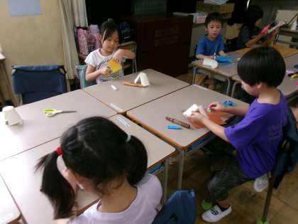底だけ残し、半分に切った紙コップを使って、パクパクと動く「パクパクパックン」をつくりました。