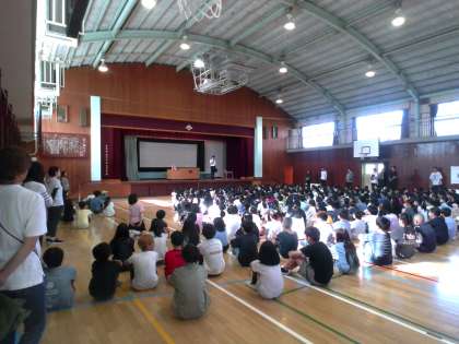 スライドを使っての説明や実験などで、水道の水がどのように作られているかを学習しました。汚れた水をきれいにする実験などもあり、皆熱心に取り組みました。1,2組は3〜6時間目に行います。 ![]() ![]() ![]() ![]() ![]() ![]() 9月22日(月)全校朝会の様子![]() ![]() ![]() ![]() 学校長から、人に対して差別的な発言、行動は絶対にしてはならないと話がありました。 その後、大会等で頑張った児童の表彰を行いました。 9月18日(木)休み時間の算数教室![]() ![]() ![]() ![]() この日の中休みは暑かったので、外遊びができませんでした。 高学年の児童が勉強をしに算数教室へ来たので、インターネットで調べた図を参考にして、「パターンブロック」で学習していました。 雨などで校庭遊びができない日、算数担当が算数教室に在室していれば、勉強することができます。 楽しみながら勉強できるようにします。 9月18日(木)お話会を行いました。