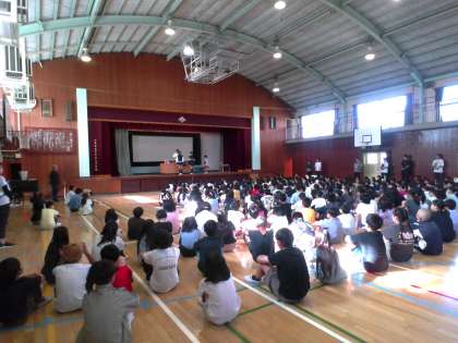 体育館で1学期の終業式を行いました。校長先生のお話、3年生代表による1学期に頑張ったことや2学期の抱負の発表の後、校歌を元気に歌いました。その後、夏休み過ごし方についてのお話と、賞状の授与を行いました。