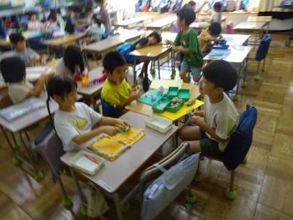 2学期が始まって2週目に入りました。まだ残暑が厳しく、校庭のWBGTの値により校庭遊びがなかなかできません。室内で工夫しながら思い思いの過ごし方をしています。6年生はあいさつ運動の準備や話合いをしたり連合音楽会の練習をしたりしていました。その他の学年は、カードゲームや百人一首、粘土あそびや折り紙、コマやけん玉などの昔遊び、タブレットを使ってタイピング練習をしていました。