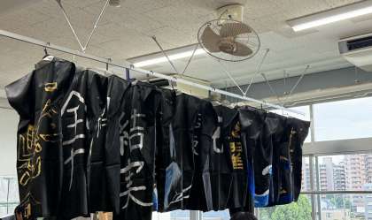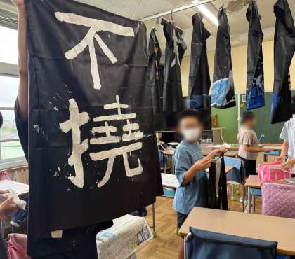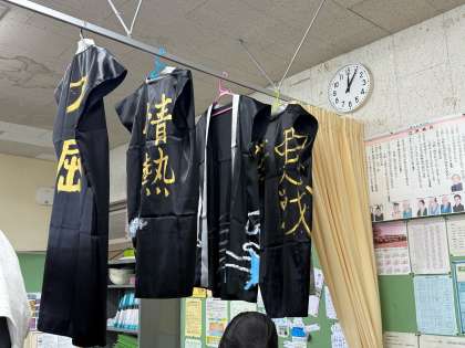 生活科の授業で二年生が手作りしたおもちゃがたくさん並び、出店のように遊ぶことができました。 「どうぞこちらへ」「もう一回やってみて!」など、二年生がやさしく案内してくれたおかげで、 一年生はお客さんとしてゲームを楽しむことができました。 二年生のお兄さん・お姉さんにあこがれる気持ちや、来年は自分たちがやってみたい!という気持ちを持ってくれるとうれしいです。 ソーラン節の法被作り!