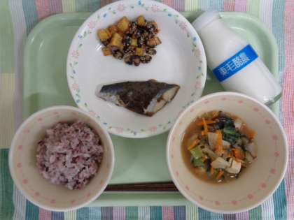 牛乳 黒米ごはん さわらの黒ごまソース 黒豆のあめがらめ もずくのみそ汁 明日9月6日は“くろ”の語呂合わせから「黒の日」となっています。これにちなんで、今日の給食は黒い食材をたくさん使った献立にしました。 海外では黒い食べ物は敬遠されがちなイメージがありますが、同じアジア圏の中国や韓国では、昔から黒い食べ物は腎臓によいと言われています。 バランスのよい食事で健康な体に!