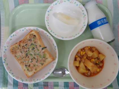 牛乳 こまツナマヨトースト チリコンカン くだもの(小平梨) 小平市では、9月を「めざましスイッチあさごはん月間」として、早寝・早起き・朝ごはんに取り組んでいます。 今日の「こまツナマヨトースト」は、朝食におすすめのメニューで、今年度から市内の統一献立として、小平市内の市立保育園、小学校、中学校で9月に登場します。 夏休みが終わり1週間が経ちましたが、生活リズムは取り戻せているでしょうか?早く寝て、早く起きて、朝ごはんを食べることで、体も頭も目が覚め、1日を気持ちよく過ごすことができます。2学期も元気に過ごすために心がけてみてください。 9月5日の給食<黒の日>