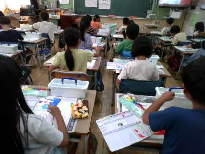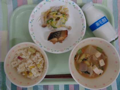 牛乳 栗いもごはん さばの香味焼き 黄菊のあえ物 豚汁 9月9日は、「重陽の節句」です。奈良時代には、この日に菊の花びらを浮かべたお酒を飲んだり、菊の花を使った料理を食べたりしたそうです。今日の給食の和え物にも菊の花を入れています。 また、重陽の節句は、別名「栗の節句」とも呼ばれるため、今日の主食は栗いもごはんにしました。 【1年生】「はじめてのえのぐ」