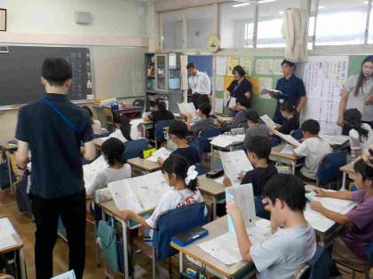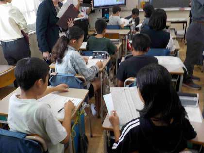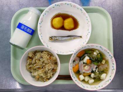 10/7 愛南町産 真鯛を使ったこんだて![]() ![]() ![]() ![]() 今日は5年生が、愛媛県愛南町の漁業について教えていただきました。愛媛県の南にある町なので、『愛南町』という名前なのだそうです。給食でも愛南町から届いた真鯛を使って鯛めしを作りました。 鯛めしは、真鯛の半身20kg以上をオーブンで焼き、手作業で身をほぐして骨を取り除き、昆布やお酒を加えて炊いたごはんと混ぜました。 講師を務めていただいた方にご挨拶をしていると、6年生の子が声をかけてくれました。「元々漁業に携わりたいと思っていたけど、昨年、愛南町の授業を受けて、愛南町で働きたいと思うようになりました。今日、給食で愛南町の鯛が使われていたから、もしかして漁業の授業をやっているのかもと思って探してました。講師の方々に、この気持ちを伝えたかったんです。」と話してくれました。 10/7 1年生 算数![]() ![]() 「○+□−△」のように、式の中にたし算とひき算があります。 どのクラスでも順番にたしたり引いたりと一つずつ丁寧に計算していました。 「+」「−」と書いてあっても、前の問題と同じように計算してしまい、「+」「−」を反対にしてしまう子もいました。 「読む見て、よく考えて」が大切です。 丁寧に何度も問題を解くことで、正しく計算できるようになっていきます。 10/7 5年生 社会科 出前授業2![]() ![]() ![]() ![]() ![]() ![]() AとB、どちらが「天然」「養殖」でしょうか? 見分け方は、参加した5年生の子たちに聞いてみてください。 貴重な体験とともに学習を深めることができました。 本日の給食ともコラボしています。 10/7 5年生 社会科 出前授業1![]() ![]() ![]() ![]() ![]() ![]() 愛媛県愛南町の漁協組合や三浦屋さんのご協力をいただき、体育館で水産業の学習をしました。 「とる漁業」「育てる漁業」についての資料をはじめ、漁師さんへのインタビューやカツオの一本釣りの様子などの動画を見ながら、水産業について詳しく学ぶことができました。 実際に一本釣りの竿を持たせてもらい、魚がかかったときの重さを感じていました。 10/6 全校朝会(表彰)2![]() ![]() ![]() ![]() 全校で紹介して、みんなで努力を称え合いたいと思います。 表彰がある場合は、どうぞお申し出ください。 10/6 全校朝会(表彰)1![]() ![]() ![]() ![]() おめでとうございます。 ・小平市民スポーツ祭剣道大会 小学3年生男子の部 3位 ・小平市民スポーツ祭剣道大会 小学4・5・6年生女子の部 2位 ・小平秋季大会(女子) 優勝 小川ミニバスケットボールクラブ 11名 ・多摩リーグ夏季大会(女子) 優勝 小川ミニバスケットボールクラブ 11名 ・Sunny Cup(男子) 2位 小川ミニバスケットボールクラブ 8名 ・小平秋季大会(男子) 優勝 小川ミニバスケットボールクラブ 8名 ・Summer Fresh Meeting(3・4年) 2位 6名 好きなことへの挑戦を続けることで、自分の得意を伸ばしてほしいです。 10/6 十五夜こんだて![]() ![]() ![]() ![]() ![]() ![]() ☆十五夜こんだて☆ 今年は10月6日の今日が十五夜です。今日は曇りの予報ですが、十五夜は1年の中で最も空が澄みわたり、月が明るく美しいと言われています。十五夜は芋名月とも呼ばれ、月見団子やすすき、里芋などをお供えします。今日は「さといもごはん」と、小平産のバターナッツかぼちゃを使った「月見団子」を楽しみました。 ★読書旬間 図書コラボメニュー★ 今日は図書コラボメニュー第七弾です。『おさかなしろくま』より、「ししゃも」を提供しました。 写真2枚目:小平産のバターナッツカボチャです。 写真3枚目:きれいな黄色に仕上がった月見団子です。 10/6 5年生 国語(研究授業)![]() ![]() ![]() ![]() ![]() ![]() こどもたちは、教材である「たずねびと」の文章表現を根拠にして主題を考えました。友達と考えを交流することで、自分の考えを広げたり深めたりしました。 考えの変化や感想をプリントにしっかり書き込んでいました。 研究授業とは、授業力の向上のため、全教員で授業を参観し、意見交流したり、講師に指導を受けたりする校内の取組です。 授業後、教員で協議を行い、講師の小平市立小平第一小学校指導教諭千葉先生に指導をいただきました。 9/22 全校朝会 校長講話「『周りの人』を思う〜6年生を手本に〜」