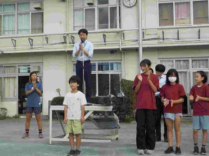 今日から2学期が始まりました。とても暑い日が続きましたが、みなさんどのような夏休みでしたか? 1学期の終業式の話で、みなさんに「夏休みにしかできないこともあります。自分の好きなことや挑戦してみたいことなどに取り組んでみてください。」と伝えました。日頃できない貴重な体験やじっくり時間をかけて挑戦したことがありましたか?ぜひ友達や十二小の先生たちに教えてください。 また、久しぶりの学校で、不安でどきどきしている人もいると思います。少しずつ学校生活に心と体を慣れさせていけば大丈夫です。何か不安なことや心配なことがあったら、独りで悩まないで、お家の人や十二小の先生たちなど、周りの大人に何でも相談してくださいね。 十二小の先生たちは、皆さんに会えるのをとても楽しみにしていました。校長先生も「安心して楽しく」2学期がスタートできるようにと思っています。 2学期は、展覧会があります。皆さんの思いのつまった作品を見るのが今から楽しみです。6年生は、移動教室、けやき学級は、宿泊学習がありますね。みんなで協力して、楽しい思い出をつくってください。 2学期も「自分も」「みんなも」笑顔いっぱいの十二小にしていきましょう。 これで先生のお話を終わります。 9月の校長講話や挨拶