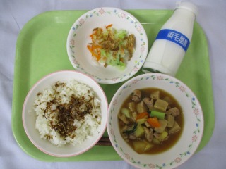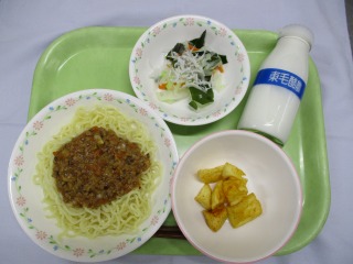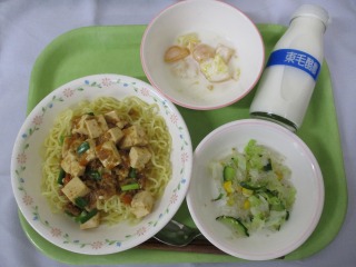 ・牛乳 ・マーボー焼きそば ・糸寒天のあえもの ・フルーツヨーグルト 今日は中華麺にマーボー豆腐をのせた『マーボー焼きそば』を作りました。仙台のB級グルメのひとつだそうです。仙台では麺は揚げたり焼いたりするそうですが、給食では蒸し焼きにしました。豆腐もたくさん入っていて、ボリューム満点のメニューでしたが、子どもたちはよく食べてくれていました。 ![]() ![]() 10月1日(水)の給食