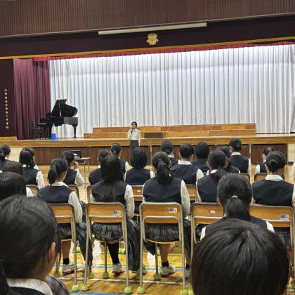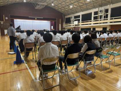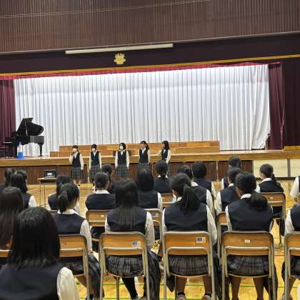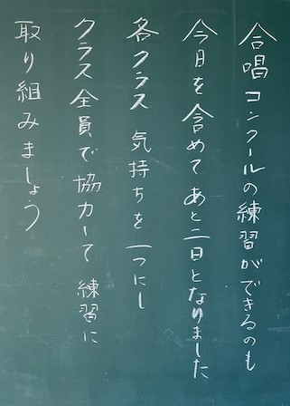 2学年は1.2時間目に合唱コンクールのリハーサルを行いました。審査員の挨拶、動きの確認をした後に、校歌の練習、各クラスの自由曲の発表をしました。音楽科の先生からは『このクラスで歌う一回限りの合唱コンクールを楽しんでほしい。』ということと、『緊張に負けて歌詞の意味や伝えたいことが伝えられていない、各パートの役割を考えて』という講評をいただきました。あと4日、本番までにこれからいかに各クラスで頑張っていくことができるか、まだまだこれからです。