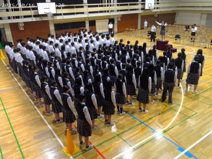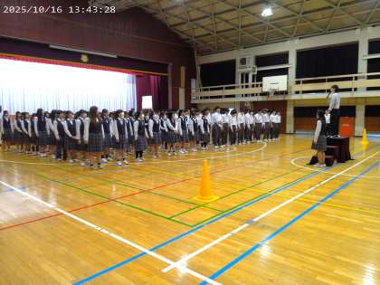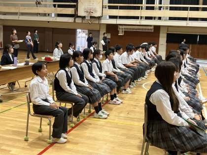 10月16日(木)3年生がS組と合同で合唱コンクールに向けてリハーサルを行いました。S組はトーンチャイムの演奏を生徒・教職員が共になって行い、3年生から拍手がわきました。3年生は学年合唱「大地讃頌」について、出入りや立ち位置の練習後、実際に通して合唱しました。本番さながらの緊張感の中、迫力ある歌声が体育館に響きました。この行事にかける3年生の想い、当日の舞台が本当に楽しみです。
