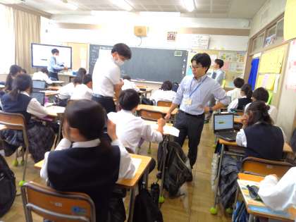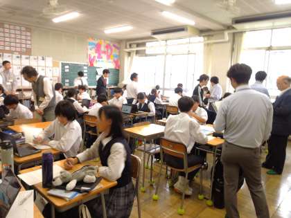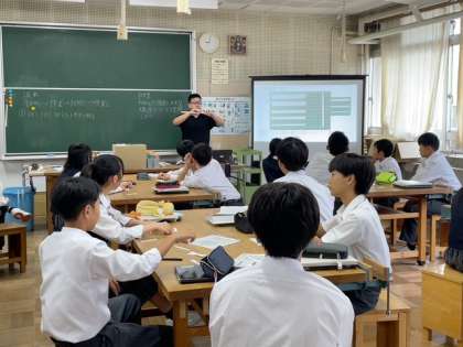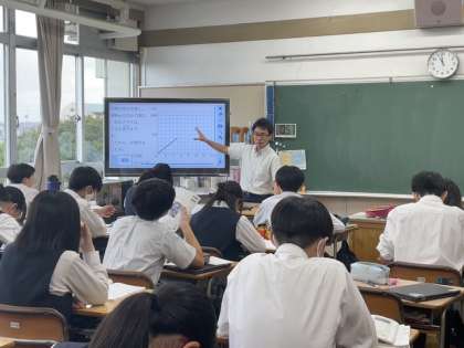 10月14日(火)2年生の数学は「一次関数のグラフの利用」について学んでいます。電車のダイヤグラムを導入に、2人組や班など様々な集団の形で話し合いながら一次関数について理解を深めました。発表の場面では非認知能力を高めていました。