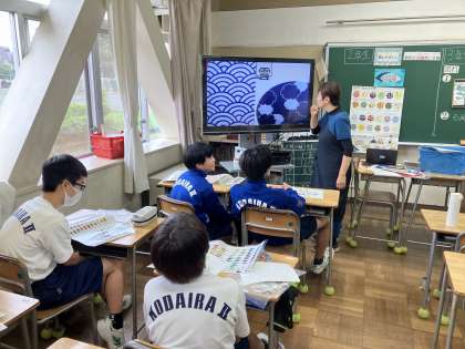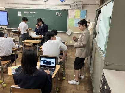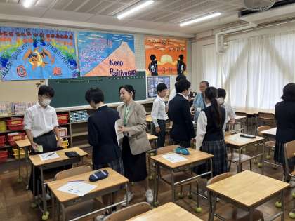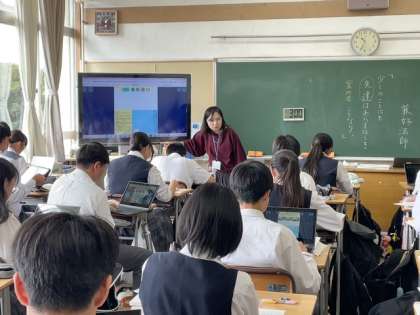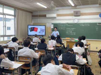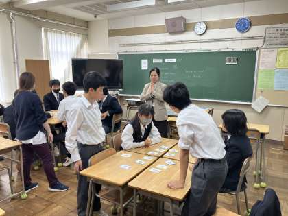 英語の授業でALTの先生に来ていただいて授業をしました。英作文の作り方をアドバイスしていただいたり、アルファベットカルタやペアワークをしました。