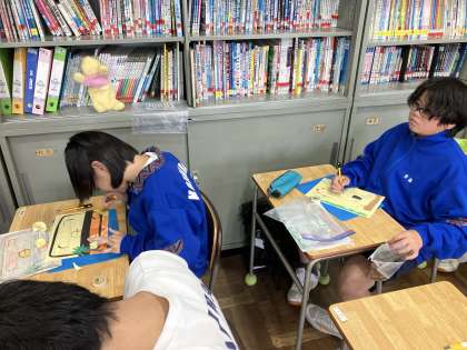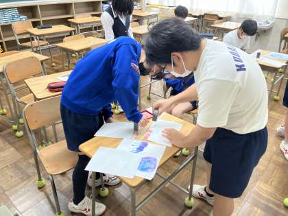 美術は学年ごとに違う作品を制作しています。1年生は砂絵、2年生は扇のデザイン、3年生はてん刻を作っています。みんな集中して取り組みました。