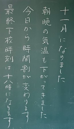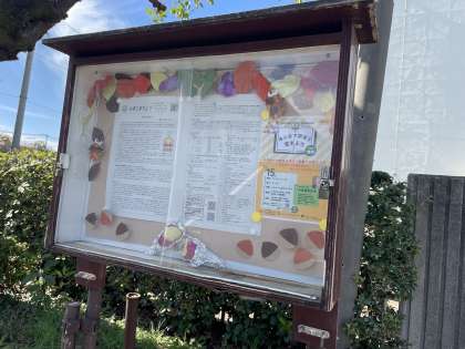 正門横の掲示板は、学校だより11月号と、今月開催するCS主催の地域向け研修会案内に代えられました。落ち葉と栗に石焼き芋、蓑虫で飾られています。全て手作りで、冬を感じる掲示です。