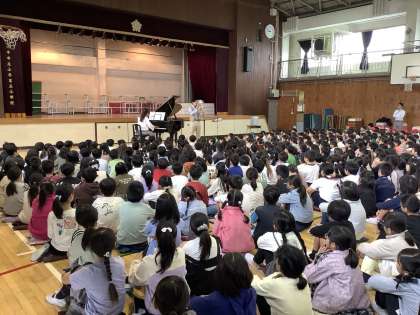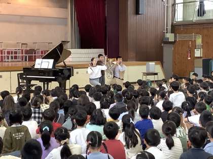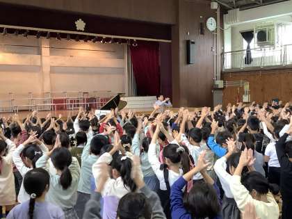 今朝も6年生の代表児童が気持ちのよいあいさつをしてくれました。 運動委員会の児童が正しい垂直とびの仕方について発表してくれました。 4年生の児童が9月に行われた将棋の大会で優勝し、その表彰も行いました。 校長先生からは、「ナイル川を渡るアリ」のお話をしました。 友達と力を合わせて協力することの大切さについて考えてほしいと思います。 エバリー音楽鑑賞教室!