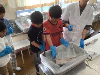 10月27日(月) 給食でいつも卸していただいている星野商店の星野様が、社会科の水産業についての出前授業をしてくださいました! 実際の漁業の現場についての講話や実際に鮭を目の前で捌いていただき、おいしくみんなで食べました。 3年、5年 たてわりペア遠足