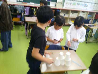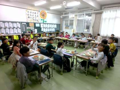 パルシステムの方をゲストティーチャーに迎え、教えていただきました。 まずは脱穀です。(一番上の写真) 稲を指でこすると、稲から米をパラパラとはがすことができます。 つぎに籾摺りです。(真ん中の写真) すり鉢のなかに米を入れ、野球ボールでゴリゴリこすると、籾が取れて玄米になります。 優しく息を吹きかけて籾殻を飛ばすと、玄米だけ残ります。(一番下の写真) 地道な作業ですが、こどもたちは夢中になって一生懸命作業していました。 「たくさん取れたよ!」と嬉しそうにしていました。 米の収穫後、脱穀・籾摺りといった大変な作業があることを知り、貴重な体験となりました。 11月7日(金)の給食