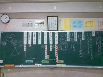 家庭科「こんだてを工夫して」の導入として、料理カードを使って献立作成をしました。 料理カードを「主食」「主菜」「副菜」コーナーに分けて配置し、栄養バランスを考えながら、メニューを選びました。 主食主菜副菜を揃えること、食べ物の3つの働きを揃えること、五大栄養素を全て含むことを目標に、材料も考えながら、より良い献立を考えました。 はじめは“食べたいもの”を選んでいた児童も、栄養バランスを考えて、違う料理に変えたり、料理を増やしたり減らしたりして工夫していました。 班で献立を見せ合い、代表の献立を黒板に掲示して、選んだポイントを発表しました。 「五大栄養素を揃えることを意識しました。」 「無機質をとるためにひじきの煮物を選びました。」 などの発表がありました。 【給食委員会】食育meet放送