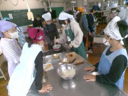 11月11日は「チーズの日」「鮭の日」「もやしの日」「箸の日」です。 そこで、 「鮭」を使った「チーズ」焼きと、「もやし」を使ったのおひたし、「箸」を使って食べる献立にしました。 「鮭とじゃがいものチーズ焼き」は、蒸したじゃがいも、下味をつけて蒸した鮭、炒めた具材を混ぜ合わせてカップに入れ、チーズとパセリをふって、オーブンで焼きました。 真ん中の写真は、チーズ焼きの具材をカップに入れているところです。 一番下の写真は、チーズとパセリを混ぜ合わせたものをのせているところです。 「さけとじゃがいものチーズやきがおいしかったです。またつくってくだい。」 「おひたしがおいしかったです。」 「のっぺい汁は、こんにゃく、里芋、豚肉が入っていてとても美味しかったです。」 などの感想が書かれていました。 【6年生食育】こんだてを工夫して