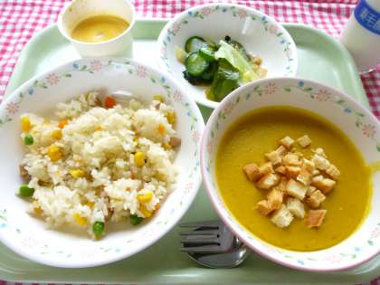 「食品ロス削減給食」として「はじっこかぼちゃのポタージュ」を作りました。 かぼちゃをデザートに使うときは、きれいな黄色を生かすために、緑色の皮の部分は捨てられてしまうことが多いですね。 今日は「かぼちゃプリン」で使われなかった緑色の皮の部分を活用して、ポタージュを作りました。 いつもは捨てられてしまうかぼちゃの皮がポタージュに大変身です! 真ん中の写真は、かぼちゃの皮です。 やわらかく煮て、ミキサーにかけて、ポタージュにしました。 一番下の写真は、カップにプリン液を注いでいるところです。 プリン液は濾してなめらかに仕上げました。 「ピラフがおいしかったです。」 「こんにゃくさらだがおいしかった。」 「かぼちゃのポタージュがおいしかったです。」 「プリンがおいしかったです。」 などの感想が書かれていました。 10月30日(木)の給食