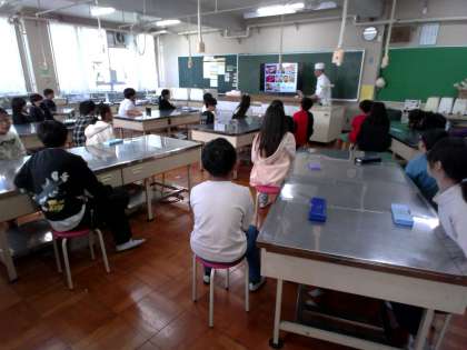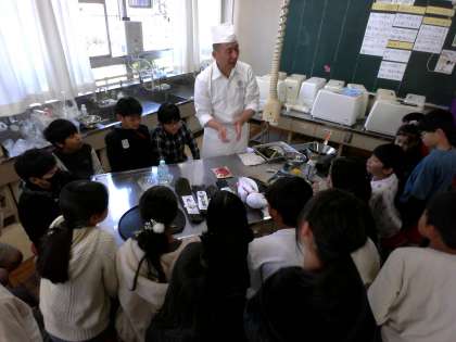 ゲストティーチャーをお招きして、和食やだしについてお話を伺いました。 和食にはいろいろな料理があることや、日本に昔から伝わる調味料や旬の食材などについて学習しました。 後半は、だしのひき方についてデモンストレーションをしていただきました。 昆布とかつお節でだしをひく様子を見て、こどもたちは目が釘付けでした。 かつお節を加える場面では「うわぁ!そんなに入れるの!!」と驚いていました。 かつおを削るのを実演していただき、ひき立てのかつお節を味見したり、水出しの昆布だし、昆布とかつお節のだしの試飲もしたりして、「おいしーい!」「家でもやりたい!」と興味津々でした。 家庭科室には、だしの良い香りがただよい、ほっこりした時間を過ごしました。 「いくら飲んでも飽きない」という講師の先生の言葉通り、ひきたてのだしの味は格別でした。 和食について知り、体験する、貴重な機会となりました。 11月4日(火)の給食
