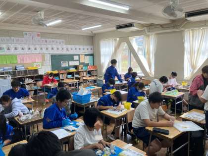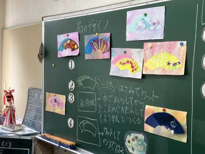 1年生は立体造形、2年生は扇のデザイン、3年生は篆刻(てんこく)を使っています。作業が進み、完成した人もいます。全員の完成が楽しみです。