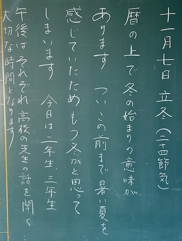11月10日(月)体育館で朝礼を行いました。校長先生が、上級生がお手本になった合唱コンクールの評価と、スマートフォンの適切な使用について、その後生活指導主任が、学校生活をもう一度見直すよう、全校生徒に話をしました。