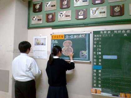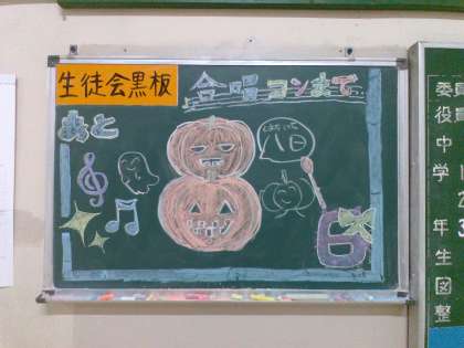 今日の生徒会黒板![]() ![]() ![]() ![]() かぼちゃのデザインが可愛いですね。 毎日、生徒会黒板を見るのが楽しみです。 パート練習![]() ![]() ![]() ![]() ![]() ![]() 歌い終わるたびに「もっと滑らかに歌おう」「ここの歌い方はこうしよう」と、活発に意見を交換し合っています。よりよい歌唱にするために課題を見付け、すぐに改善しようとする姿勢が素晴らしいです。 【3年生】修学旅行の事後学習発表会![]() ![]() ![]() ![]() ![]() ![]() 発表では、京都の街並みや文化財、またオーバーツーリズムに代表される課題など、多様な内容が取り上げられました。修学旅行を楽しい行事で終えるのではなく、学びのある活動として振り返ることができた様子がうかがえました。まさにスローガン「楽学両道」を体現した3日間になったのではないかと思います。 これまで全4回にわたり総合的な学習の時間で事後学習を進めてきましたが、本日の発表はその集大成といえるものでした。発表することは生徒にとって少なからず緊張や負担を伴いますが、その経験を通して得られる学びも大きいものです。 修学旅行では多くの思い出をつくり、同時に学習面でも確かな成長がありました。本日の発表からも、生徒たちがその意義をしっかり理解していることが伝わってきました。 環境衛生検査![]() ![]() ![]() ![]() 学校薬剤師さんに、教室の黒板検査と照度検査を実施していただきました。生徒が安全で快適な環境で過ごせるように、定期的に検査を行っています。 パート練習![]() ![]() ![]() ![]() きれいな歌声が各クラスから聞こえてきます。 合唱コンクールのポスター![]() ![]() 大変素晴らしい仕上がりとなりました。 合唱コンクール当日は会場に展示しますので ぜひお近くでご覧ください。 保健委員による献立紹介![]() ![]() ![]() ![]() ミルクコーヒー、食パン、ブルーベリージャム、コーンチャウダー、いかのバジルフリッター、千切りサラダです。 「目の愛護デー」に合わせた献立でした。 ブルーベリージャムは小平市内産です! 昼休みの保健室![]() ![]() ![]() ![]() 「1cm差だ」「給食の後だから体重増えてるかも」と楽しそうに測定していました。 廊下では2年生が間違い探しをしていました。 7つの間違い見つかったかな? * 合唱コンクールに向けて![]() ![]() ![]() ![]() 合唱コンクールまで、あと17日 2年生のリハーサルの様子です。 練習は始まったばかりですが 真剣に取り組む姿から、本番への意気込みが伝わってきます。 後期保健委員会![]() ![]() ![]() ![]() 今日の保健委員会では ハンカチチェックの実施方法と点検場所の確認をしました。 生徒会黒板![]() ![]() 合唱コンクールの練習が本格的に始まります! 絵手紙の会![]() ![]() 南校舎1階廊下の掲示板には 「上水南公民館 絵手紙の会」の作品を掲示しています。 10月10日は目の愛護デー![]() ![]() 学生ボランティアさんと一緒に 「目」に関する掲示物を作成しました。 9/11 感謝状をいただきました![]() ![]() 【3年生】修学旅行の新幹線座席・宿舎班決め