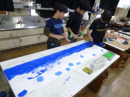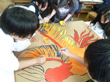 各クラスごとに想像した「音楽の神さま」を、各学年の発表曲からのイメージ画を3〜4枚分担してつくりました。会場上部のギャラリーに展示されますので、ぜに来場の際には見上げて観てください。