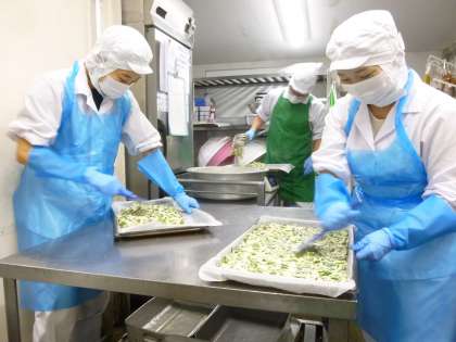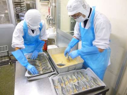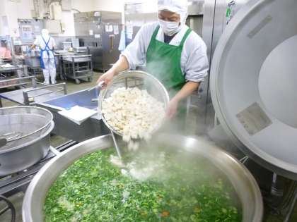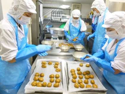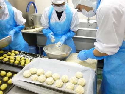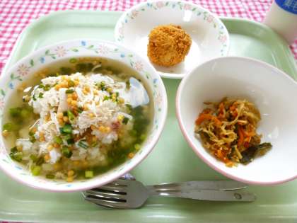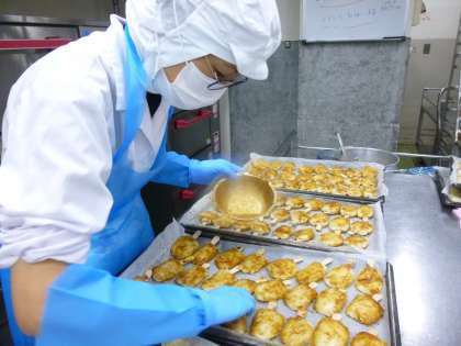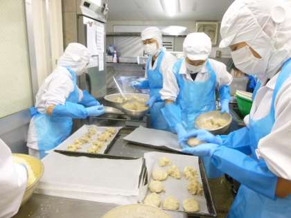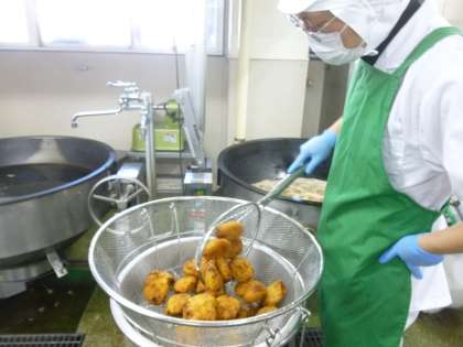 「食品ロス削減給食」第31回目として「復活梅じゃこ茶漬け」を作りました。 アルファ化米100%でごはんを炊きました。 お茶漬けにすると、アルファ化米もおいしく食べることができます。 真ん中の写真は、お茶漬けにトッピングした鶏のささ身(蒸したもの)を細かくほぐしているところです。 日本料理は、季節を感じるような飾りつけや細工をし、四季折々の彩りがあります。 「いが栗揚げ」もそのひとつです。 「いが栗揚げ」は、「いが栗」をイメージして作った料理です。 給食では、小平産のさつまいもを蒸してつぶし、白玉粉、さとう、塩、バター、牛乳を混ぜ合わせ、まわりにそうめんをまぶして油で揚げました。 細かく砕いたそうめんが「いが栗」を表現しています。 一番下の写真は、さつまいもの具を丸めて、周りにそうめんをまぶしているところです。 「おちゃづけがめちゃめちゃおいしかったです。」 「お茶づけが出汁がきいていておいしかったです。」 「はりはりふうみがおいしかったです!!」 「いがぐり揚げがカリカリで美味しかったです。」 などの感想が書かれていました。 12月1日(月)の給食