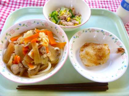 今日は「食品ロス削減給食」です。「復活ごへいもち」を作りました。 「復活ごへいもち」は、防災備蓄食品のアルファー化米を使って作りました。 アルファー化米を炊いて、つぶして、タレをぬってオーブンで焼き、ごへいもちにしました。 以前の給食で提供したアイスクリームのスプーンも捨てずにとっておいて、ごへいもちの棒に活用しました。 真ん中の写真は、ごへいもちを成形しているところです。 一番下の写真は、一度焼いたごへいもちにタレを塗っているところです。 タレを塗ったあとに再度焼いて、また取り出して裏面にタレを塗って焼いて…と繰り返しました。 「うどんがおいしかったです。」 「ツナサラダがすごくおいしかった!」 「ふっかつごへいもちがもちもちしてておいしかったです。」 「ごへいもちがおいしかったです。またつくってください。」 などの感想が書かれていました。 11月22日(土)の給食