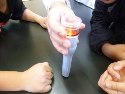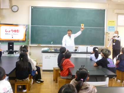 それにあわせて、「しょうゆ塾」の出前授業を行いました。 はじめに、しょうゆの原材料について学習をしました。 こどもたちに問いかけると、「大豆」「こうじ菌」等が挙がりました。 正解は「大豆」「小麦」「塩」です。 「あぁ〜なるほど!」と新しい発見がありました。 しょうゆ工場の動画を見て、しょうゆが作られる工程を学びました。 こうじ菌が増えて大豆が変化する様子に驚いていました。 工場から届いた「しょうゆのしぼりかす」も触りました。(真ん中の写真) しょうゆの香りがして、「いい香り!」「ずっと嗅いでいたい!」とこどもたち。 「しょうゆの色は何色だと思う?」という問いには「茶色」「黒」が挙がりましたが、ライトに照らしてみると、鮮やかな赤色ということもわかりました。(一番下の写真) 「今日の給食にもしょうゆが使われているの?」と聞かれたので、「使っているよ」と答えると「やったー!」と喜んでいました。 しょうゆについて楽しく学ぶことができました。 11月27日(木)の給食