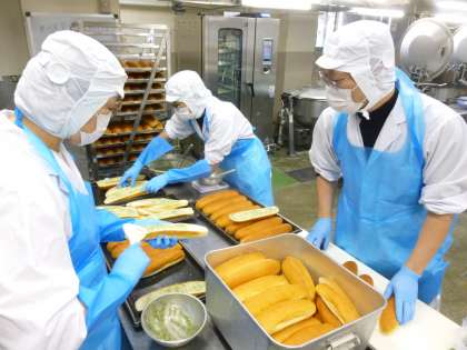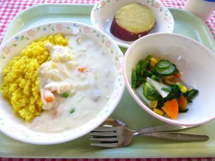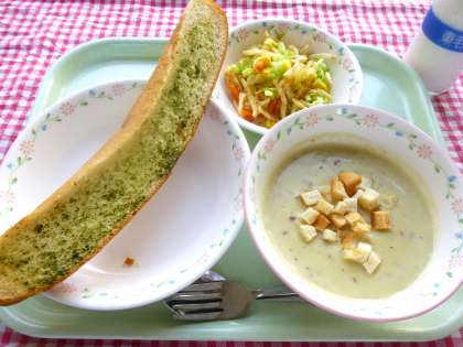 「食品ロス削減給食」として「かくれんぼさつまいもポタージュ」を作りました。 さつまいもは皮ごと使い、サラダに使ったにんじんの皮もかくれんぼしています。 また、防災備蓄品のアルファ化米もかくれんぼしています。 ポタージュのとろみづけとしてアルファ化米を使用しました。 ポタージュに使ったさつまいもは小平産です。 真ん中の写真は、ポタージュを煮込んでいるところです。 「サウピカンサラダ」は細切りにしたじゃがいもを素揚げして、トッピングしました。 「ガーリックトースト」は、にんにく、バター、オリーブオイル、パセリを混ぜ合わせたものを塗ってオーブンで焼きました。(一番下の写真) 「ガーリックトーストがおいしかたです。」 「ぜんぶおいしいし、パンが長くてびっくり!!」 「サラダのカリカリがおいしかった!」 「ポタージュがおいしかったです。またつくってください。」 などの感想が書かれていました。 12月4日(木)の給食