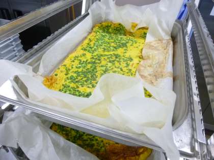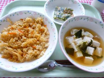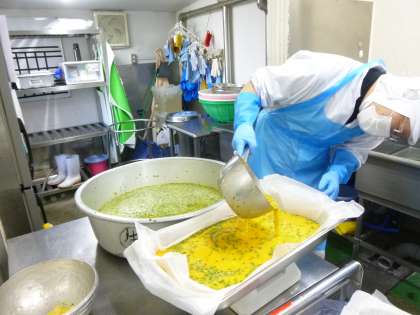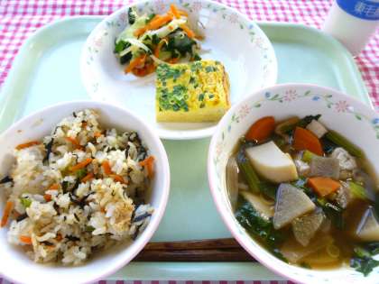 「たまご焼き」は、たまご、クリームコーン、小ねぎ、さとう、塩、しょうゆ、みりん、だし汁を混ぜ合わせたものを天板に流し入れ、オーブンで蒸し焼きにしました。 クリームコーンの優しい甘味がおいしさをひき立てています。 真ん中の写真は、たまご液を天板に流し入れているところです。 一番下の写真は、たまご焼きが焼きあがったところです。 「ひじき混ぜずし」は、とり肉、干ししいたけ、油揚げ、にんじん、ひじき、小松菜を使って作りました。 「甘酢」が味の決め手です。 「ひじきまぜずしがおいしかったで〜す!」 「たまごやきがおいしかったです。またつくってください。」 「おひたしがおいしかったです。」 「けんちんじるがおいしかったです。」 などの感想が書かれていました。 11月28日(金)の給食