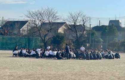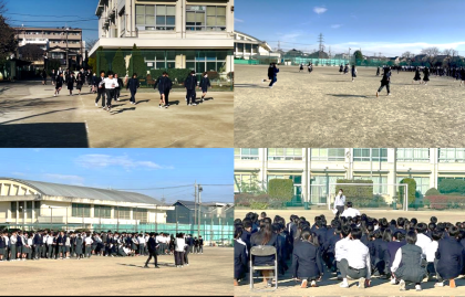 今回の訓練は通常と違い事前予告なしで実施しました。時間は昼休みです。 みんな思い思いの活動をしています。緊急放送が地震の発生を告げました。校舎内外なにいる生徒たちは、揺れが収まるまでしゃがみ固まります。校庭の生徒たちも校庭の中心に素早く集まっていました。 その後避難が始まり、校庭に全員が無事に集合しました。いつもの集団での行動と違い、行動は素早くできましたが・・・それぞれの活動でしたので少々話し声などが聞こえてきてしまったのが残念でした。 訓練をおろそかにしないよう、次回につなげていきましょう。 同じく4時間目・・教師道場研究授業
