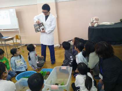 1年1組が1,2時間目に動物ふれあい体験を行いました。保護者の方にも参加していただき、動物病院の先生のお話の後、実際にウサギ、ウズラ、カメを膝に抱いたり、観察したりしました。1年2組は3,4時間目に行います。