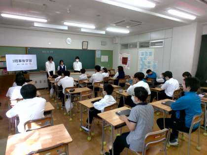 10/14 今日の給食![]() ![]() 牛乳 セサミトースト 秋野菜のホワイトシチュー ほうれん草サラダ 今日もおいしい給食をありがとうございます。 【小平市学校給食センター ホームページ】 献立の説明や豆知識など掲載されています。よろしければこちらもご覧ください。 https://www.kodaira.ed.jp/swas/index.php?id=center 【おいしい給食】 2024-09-25 14:14 up! 10/10 今日の給食![]() ![]() 牛乳 麻婆なす丼 ビーフンソテー りんご 今日もおいしい給食をありがとうございます。 【小平市学校給食センター ホームページ】 献立の説明や豆知識など掲載されています。よろしければこちらもご覧ください。 https://www.kodaira.ed.jp/swas/index.php?id=center 【おいしい給食】 2024-09-25 14:14 up! 【7組】宿泊学習事後学習![]() ![]() ![]() ![]() ![]() ![]() 宿泊学習で学んだことをそれぞれの班でまとめ、しっかりと発表することができました。 発表の仕方も、聞く姿勢も良くなっています。 10/9 今日の給食![]() ![]() ミルクコーヒー 食パン ブルーベリージャム コーンチャウダー いかのバジルフリッター 千切りサラダ 今日もおいしい給食をありがとうございます。 【小平市学校給食センター ホームページ】 献立の説明や豆知識など掲載されています。よろしければこちらもご覧ください。 https://www.kodaira.ed.jp/swas/index.php?id=center 【おいしい給食】 2024-09-25 14:14 up! 【3年生】歌練習の様子![]() ![]() ![]() ![]() ![]() ![]() 明日の3・4校時はリハーサルなので、当日の動きなどを確認していきます。 そして本番前に他のクラスの合唱を聞くことができる最初で最後の機会。リハーサルを経て、どこまで完成度を高めていけるかとても楽しみです。 最後の花南中での合唱コンクール、最高のステージを創り上げていきましょう! 放課後学習教室![]() ![]() ![]() ![]() ![]() ![]() 自主学習に加え、英検2次対策やEsatJ対策もあります。 分からない問題に優しく教えてくれるスタッフが待っています。ぜひ気軽に参加してみてください。 10/8 今日の給食![]() ![]() 牛乳 ごはん 豆乳坦々スープ 春巻 五目きんぴら 今日もおいしい給食をありがとうございます。 【小平市学校給食センター ホームページ】 献立の説明や豆知識など掲載されています。よろしければこちらもご覧ください。 https://www.kodaira.ed.jp/swas/index.php?id=center 【おいしい給食】 2024-09-25 14:14 up! 10/7 今日の給食![]() ![]() 牛乳 秋の香りごはん かき玉汁 秋刀魚の塩焼き 白菜の塩昆布和え 今日もおいしい給食をありがとうございます。 【小平市学校給食センター ホームページ】 献立の説明や豆知識など掲載されています。よろしければこちらもご覧ください。 https://www.kodaira.ed.jp/swas/index.php?id=center 【おいしい給食】 2024-09-25 14:14 up! 10/6 今日の給食![]() ![]() 牛乳 ごはん 丸ごとわかめスープ 厚揚げと豚肉のねぎ塩炒め 柿 今日もおいしい給食をありがとうございます。 【小平市学校給食センター ホームページ】 献立の説明や豆知識など掲載されています。よろしければこちらもご覧ください。 https://www.kodaira.ed.jp/swas/index.php?id=center 【おいしい給食】 2024-09-25 14:14 up! 10/3 今日の給食![]() ![]() 牛乳 肉わかめうどん カリカリじゃこサラダ さつま芋のごま団子 今日もおいしい給食をありがとうございます。 【小平市学校給食センター ホームページ】 献立の説明や豆知識など掲載されています。よろしければこちらもご覧ください。 https://www.kodaira.ed.jp/swas/index.php?id=center 【おいしい給食】 2024-09-25 14:14 up! 【7組】宿泊学習![]() ![]() とても実りのある2日間だったと思います。 今回の宿泊学習で学んだことを活かして、これからの学校生活を頑張ってほしいと思います。 【7組】宿泊学習![]() ![]() ![]() ![]() ![]() ![]() ホテルのプロの方にマナーを教えてもらいながらコース料理をいただきました。 緊張しながらもナイフ&フォークを上手に使って食べることができました。 【7組】宿泊学習![]() ![]() ![]() ![]() ![]() ![]() 本館でスクールプログラムを受けてから班行動になります。 【7組】宿泊学習![]() ![]() ![]() ![]() ![]() ![]() 朝食もしっかりと食べています。 今日は東京国立博物館を見学した後に、 グランニッコー東京台場でテーブルマナー講習です。 【7組】宿泊学習![]() ![]() 9時30分には就寝しました。 【7組】宿泊学習![]() ![]() ![]() ![]() ![]() ![]() この後は日記を書き終わったら自由時間です。 【7組】宿泊学習![]() ![]() ![]() ![]() ![]() ![]() リアルな震災現場を見ながらクイズに答えました。 【7組】宿泊学習![]() ![]() ![]() ![]() ![]() ![]() 次は「そなエリア東京」で防災体験です。 10/2 今日の給食![]() ![]() 牛乳 深川飯 じゃが芋と玉ねぎの味噌汁 擬製豆腐 糸寒天のサラダ 今日もおいしい給食をありがとうございます。 【小平市学校給食センター ホームページ】 献立の説明や豆知識など掲載されています。よろしければこちらもご覧ください。 https://www.kodaira.ed.jp/swas/index.php?id=center 【おいしい給食】 2024-09-25 14:14 up! 【7組】宿泊学習![]() ![]() みんなワクワクしています。どんな仕事を