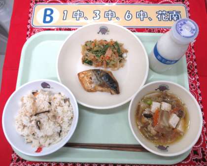 牛乳 どんどろけ飯 じゃぶ汁 鯖のさんしょう焼き きな粉ごま和え 今日もおいしい給食をありがとうございます。 【小平市学校給食センター ホームページ】 献立の説明や豆知識など掲載されています。よろしければこちらもご覧ください。 https://www.kodaira.ed.jp/swas/index.php?id=center 【おいしい給食】 2024-09-25 14:14 up! 11/17 今日の給食