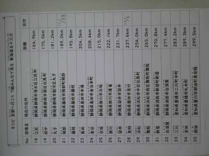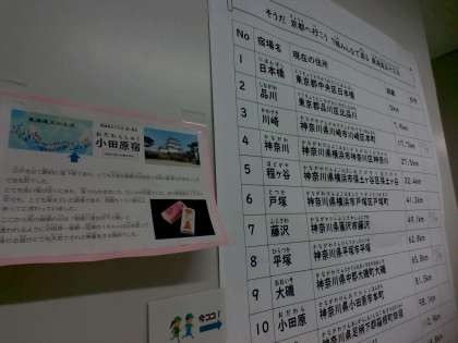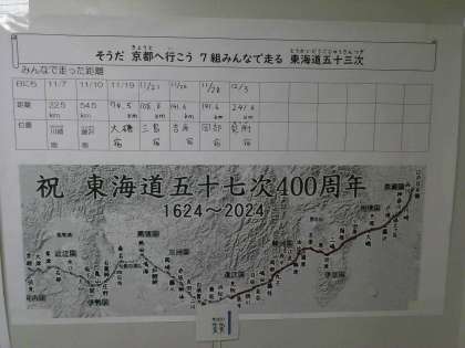 これは、修学旅行へ向けての取り組みではありません。 体育の授業での取り組みです。 12月18日に行われるマラソン大会(多摩地区の特別支援学級の大会)に向けて、体育の授業で長距離走に取り組んでいます。 2,3年生は、1年前と比べて力強い走りへと進化しています。1年生は自分のペースを崩さずに黙々と走っています。 毎時間、お互いに声をかけて励まし合いながら、一人一人が自分の力を出し切って走っています。 「そうだ 京都へ行こう 7組みんなで走る 東海道五十三次」は、授業で走った距離を全員分合計し、東海道の日本橋から京都までを走り切ろうというというものです。 今は、大磯を過ぎ、もうすぐ小田原に着きそうです。昨年の宿泊学習での見学場所でもあるので、「なつかしい〜」と盛り上がっっています。 みんなで走れば京都へ行ける! みんなでがんばる7組です。 11/20 今日の給食