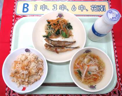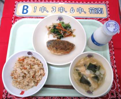 牛乳 青大豆の炊き込みご飯 じゃが芋の味噌汁 鯵のおろしソースかけ おかか和え 今日もおいしい給食をありがとうございます。 【小平市学校給食センター ホームページ】 献立の説明や豆知識など掲載されています。よろしければこちらもご覧ください。 https://www.kodaira.ed.jp/swas/index.php?id=center 【おいしい給食】 2024-09-25 14:14 up! 12/1 今日の給食