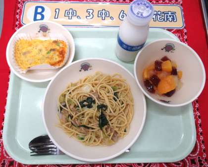 牛乳 ツナおろしスパゲティ じゃが芋とベーコンの香草炒め ミックスフルーツ 今日もおいしい給食をありがとうございます。 【小平市学校給食センター ホームページ】 献立の説明や豆知識など掲載されています。よろしければこちらもご覧ください。 https://www.kodaira.ed.jp/swas/index.php?id=center 【おいしい給食】 2024-09-25 14:14 up! 11/14 今日の給食