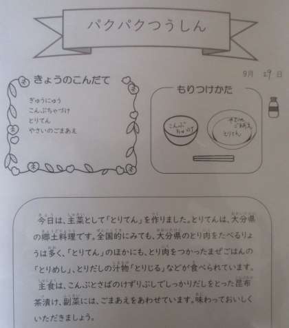 今日は、「先生!ダンゴムシが脱皮している!」とダンゴムシが脱皮している様子を見つけることができました。写真はそのときの様子です。 また、ダンゴムシを育てている子が「カタツムリの赤ちゃんがいた!」と、1ミリほどのカタツムリを大発見!! とても細かく観察している飼育員さんたちでした。 ![]() ![]() 学校だより10月号を配付しました![]() ![]() 明日から10月。引き続きよろしくお願いいたします。(校長) 9月30日の給食![]() ![]() ![]() ![]() 1年生 2年生のお店屋さんに招待されたよ