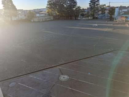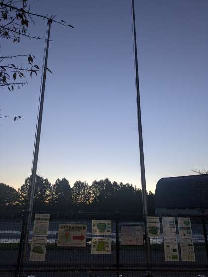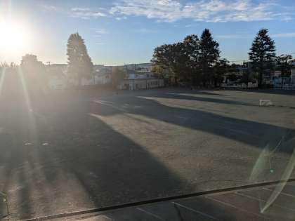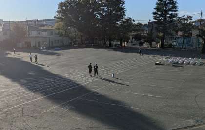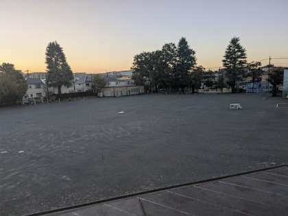 学校到着、本校の校庭は水はけがいいです。ちょっと真ん中あたりに溜まりがあるので作業します。
