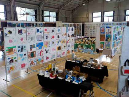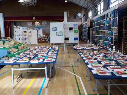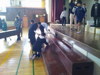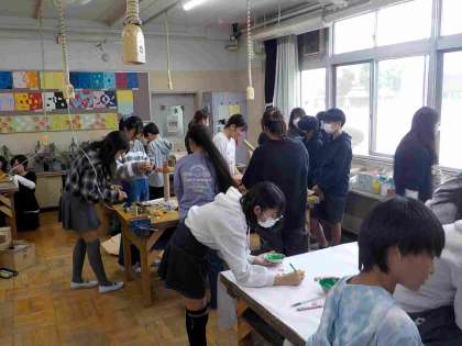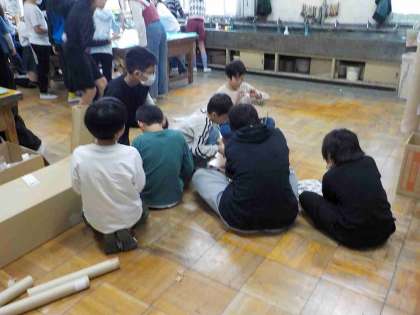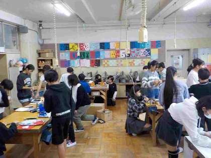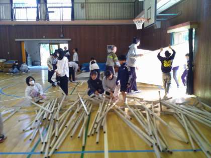 昨日は、平面作品、本日は、立体作品を体育館に運び入れました。 まだ全員分そろってはいませんが、こどもたちの作品が並ぶと、会場が華やかになり「いよいよ展覧会」との雰囲気が出てきました。 作品を並べたり、会場を飾り付けたりと仕上げはこれからですが、体育館をさらに彩っていきます。 こどもたちの思いのあふれた作品を楽しみにしてください。 11/4 月見だんご汁