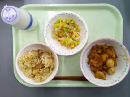 今日は、秋らしいメニューでした。栗ごはんや月見だんご汁など、見て楽しい、食べておいしい給食で、こどもたちはとても喜んでいました。 11/4 1年生 サツマイモ掘り3