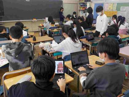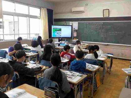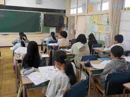 解答を振り返り、直しをするだけでなく、問題の英文を聞き返しながら、問題文の内容や聞き取りのポイントを1問ずつ丁寧に確認しました。しっかりと聞き取れているこどもが多く、外国語への慣れを感じました。 理科の授業では、教科書の資料を基に、起こりうる災害について考えました。今までの学習内容を振り返りながら予想し考えました。学習したことをもとに考える習慣を身に付けていきます。 11/13 5年生 社会科 国語