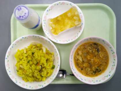 また、展覧会の「感想の花畑」の温かな言葉、こどもたちの大きな励ましとなりました。ご協力いただき、ありがとうございました。 こどもたち同士の「感想の花畑」も満開となりました。 笑顔で鑑賞する姿からこどもたちの達成感や感動がとてもよく伝わってきました。 11/8 キラキラカレーピラフ・キラキラトマトスープ