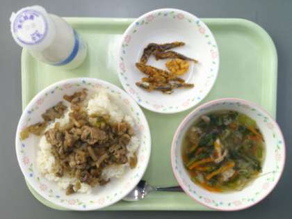 楽譜に気を付けることを書き込んだり、意識して指揮者に視線を向けたりと、こどもたちの気持ちの高まりを感じました。いよいよ来週から体育館で合同練習が始まります。 図工の時間は、展覧会の振り返りをしました。 自分の作品の写真を振り返りプリントに貼り、感想を書きました。 同じテーマでも一人一人の思いや表現の仕方に違いがあることに目を向けて、感想を書いている子もいました。 11/14 豚丼